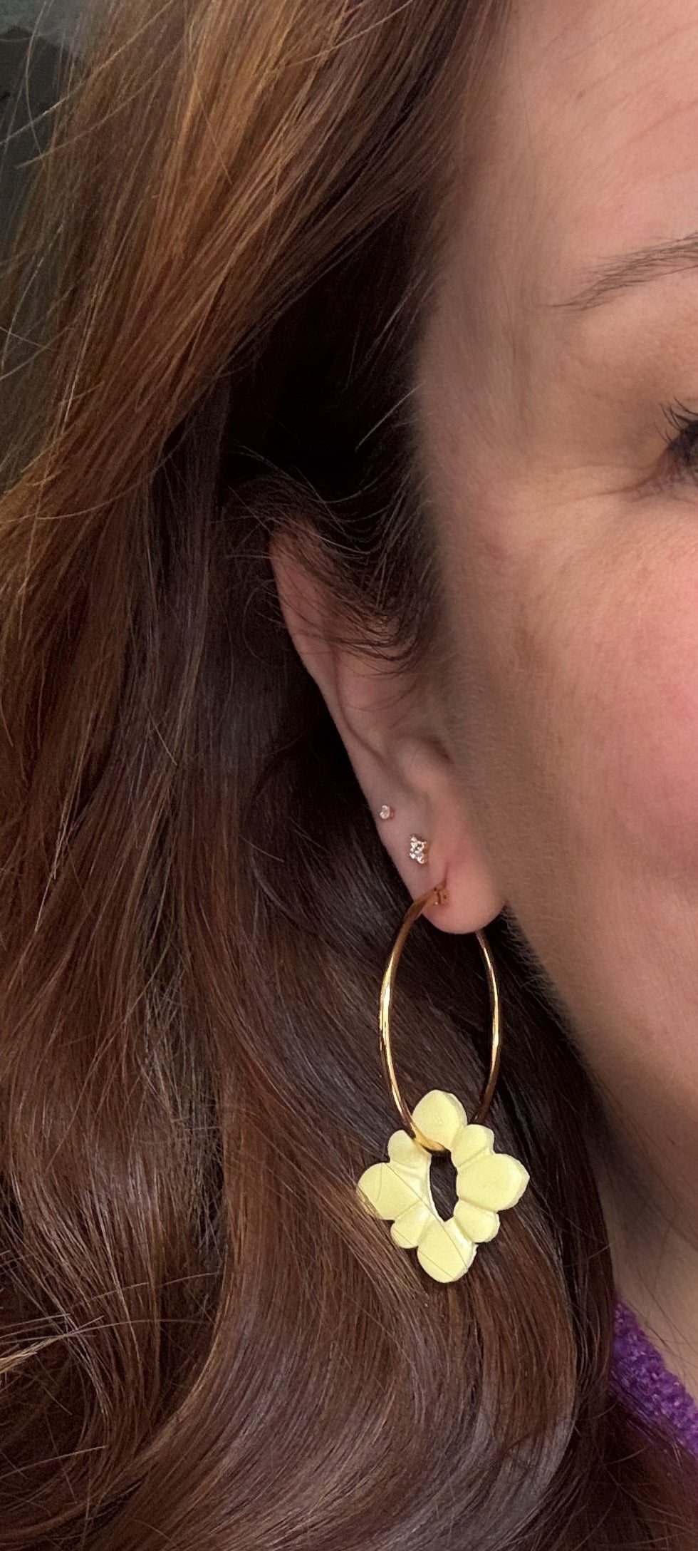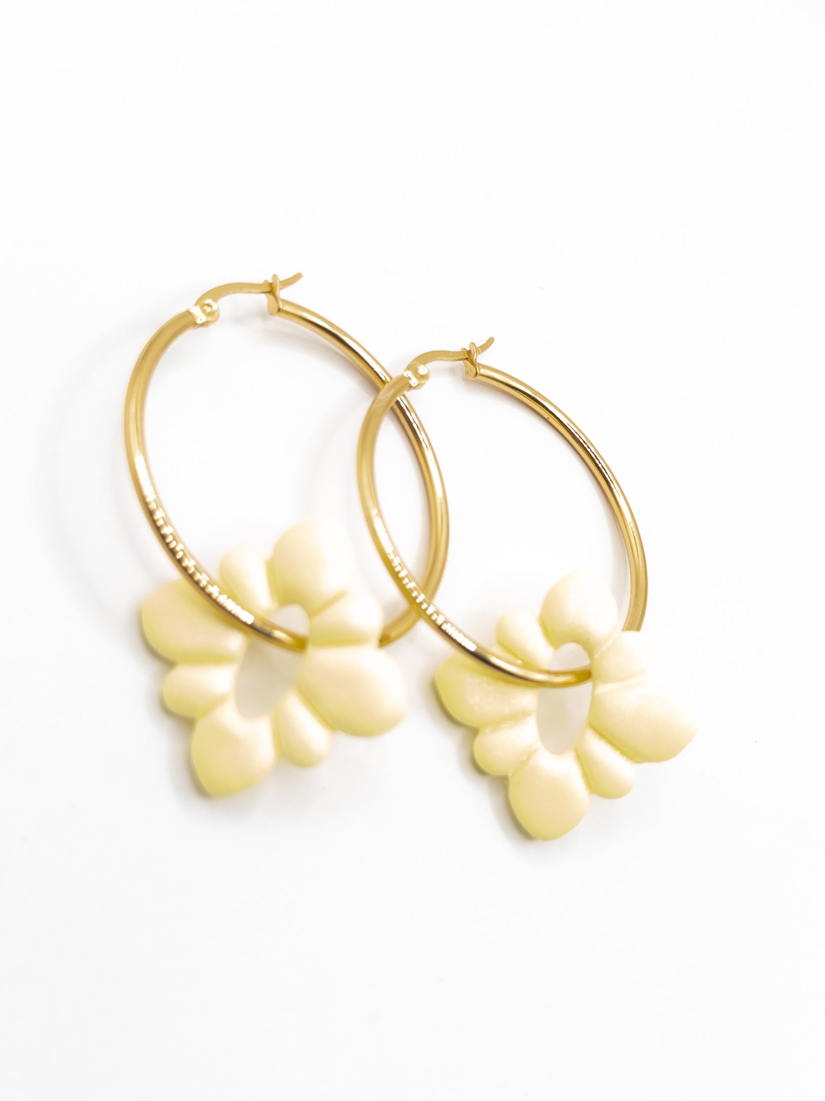 Prachtige handgemaakte hangers in zacht geel, botergeel met een glans. De creolen hebben een doorsnee van 4 cm. De oorbellen zijn ook zonder de bloemhangers te dragen. De totale lengte is bijna 6 centimeter inclusief hanger.